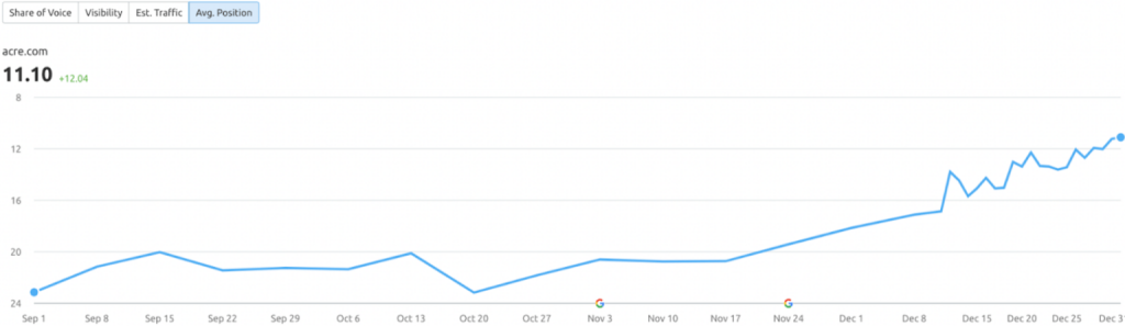 From 1st September – 1st December, Acre’s UK site’s average position for those keywords that had improved in the top 100 now is 11.10, improving from September’s reading by over 12 places!