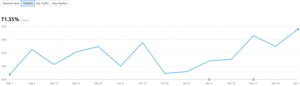 - From 1st September to 1st December, average position of top 3 keywords on Acre’s USsite rose substantially to 71.35%(by 10.22 places)!