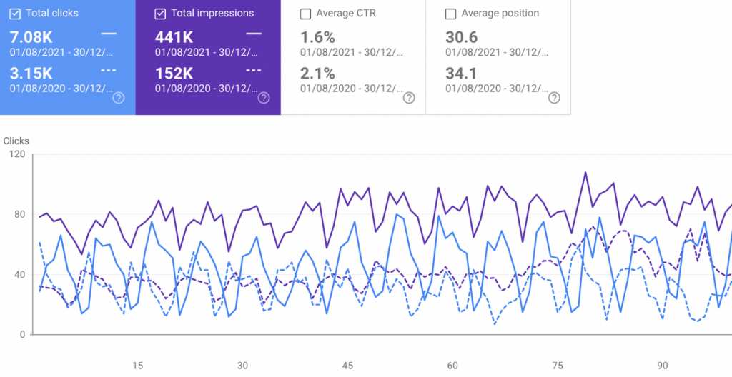 - Total clickson Acre’s US site increased from 3.15K to 7.08K, a 125% increase! Total impressions on Acre’s US site increased from a 152K to 441K, which is a massive increase of 190%!