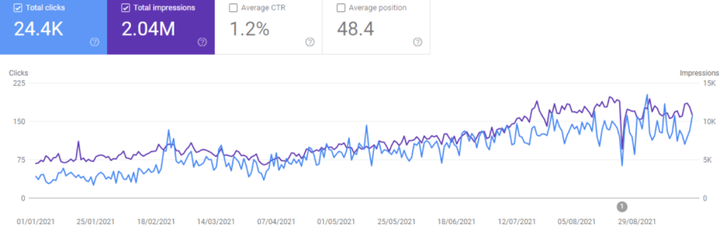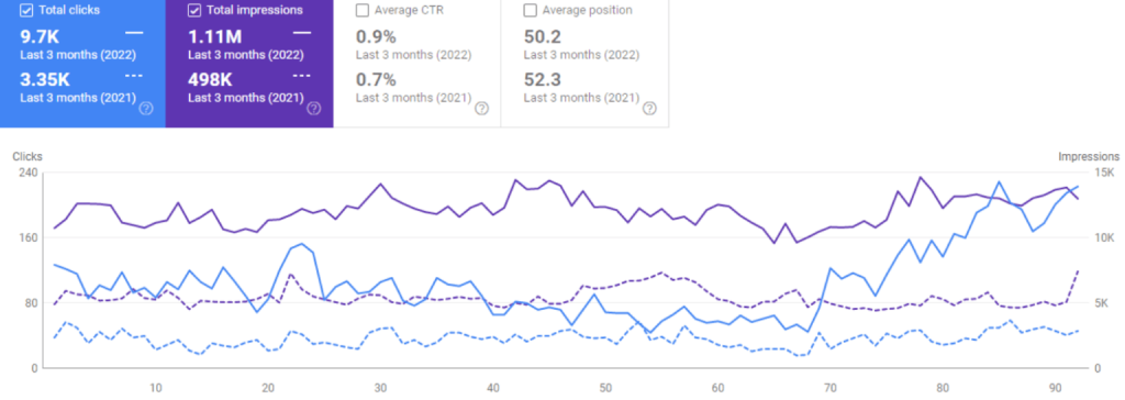 - Over the last three months, the site had 9,700 clicks and 1,110,000 impressions, whilst the previous months the site had only 3,350 clicks and 498,000 impressions.