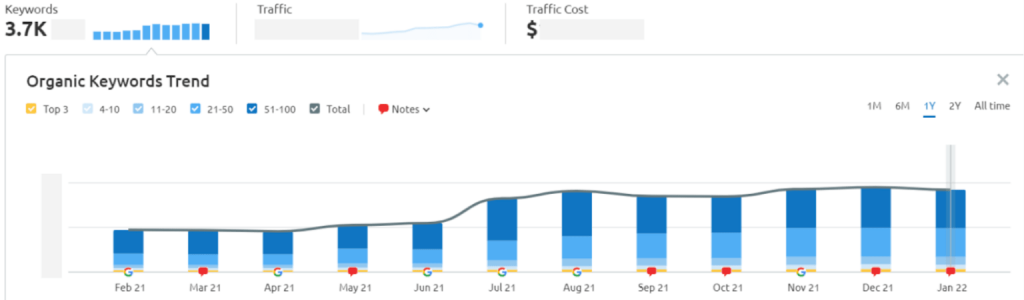 • The number of UK keywords being ranked for has increased by 1798 over the past 12 months from 1892 to 3690!